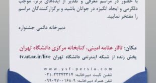 فرهیخته گرامی با سلام و احترامبدینوسیله به استحضار میرساند؛ مراسم اختتامیه نهمین دوره جشنواره اندیشمندان و دانشمندان جوان، با محوریت علوم پایه و رویکرد ویژه هوشمندسازی معدن و صنایع معدنی، در تاریخ ۲۶ آذرماه از ساعت ۱۴ در دانشگاه تهران برگزار خواهد شد.با افتخار از حضرتعالی دعوت به عمل میآید …