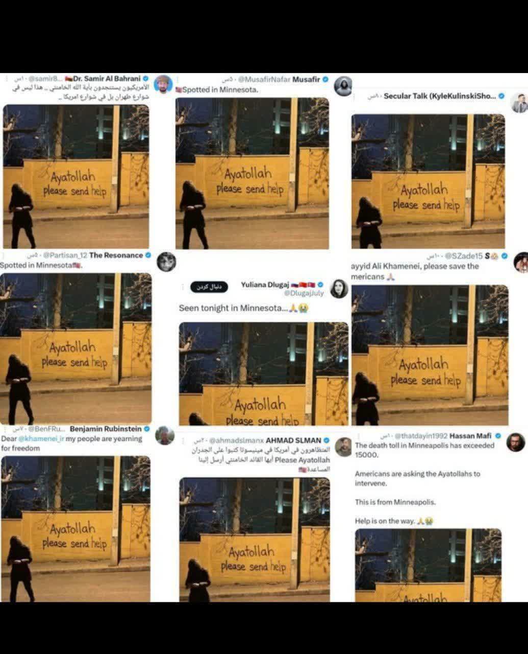این تصویر که از اعتراضات آمریکا ثبت شده به شکل برجسته در حال چرخش گستردهای در فضای مجازی کشورهای خارجی است. شعار روی دیوار این است: آیت الله (خامنهای) برای ما کمک بفرست.